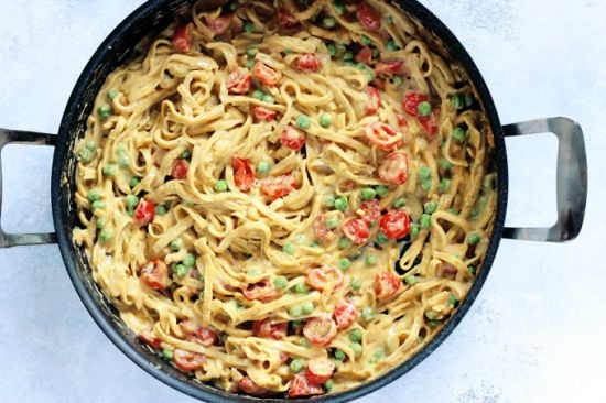 8. Vegan Fettuccine Alfredo with Peas and Roasted Cherry Tomatoes